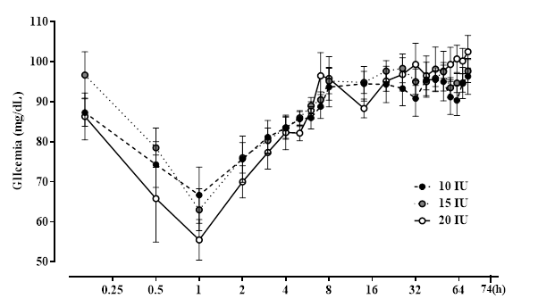 La farmacocinética para las dosis de 15 y 20 UI fue lineal, pero no se logró establecer una curva farmacocinética para la dosis de 10 UI, porque la técnica analítica no fue lo suficientemente sensible para detectar la concentración de insulina en el líquido sinovial a 1 h. Las curvas para las dosis de 15 y 20 UI parecían similares, pero se encontraron ligeras diferencias en los valores farmacocinéticos. Por ejemplo, para la dosis de 15 UI, el tiempo de residencia de la insulina, el tiempo de concentración máxima y el área bajo la curva fueron ligeramente, pero no significativamente diferentes de los de la dosis de 20 UI. Para ambas dosis (15 y 20 UI), el tiempo de concentración máxima fue de entre 17-20 min, lo que se correlaciona con la disminución de la concentración de glucosa en la sangre observada a los 30 min después de la inyección intraarticular.