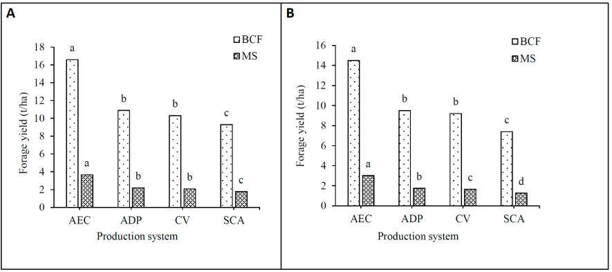 BCF= biomass of the forage component (BFC); MS= dry matter (DM); AEC= trees in alleys (TIAs); ADP= trees scattered in paddock (TSP); CV= living fences (LFs); SCA= open field system (OFS).
