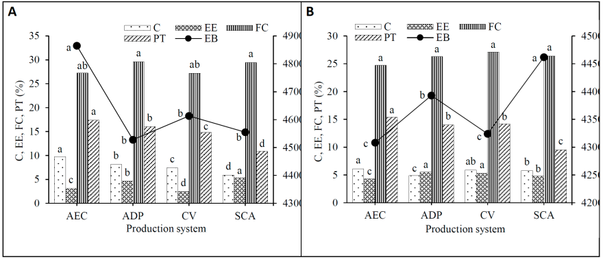 C= ash (A), EE= ethereal extract, FC= crude fiber (CF), PT= total protein (TP), EB= gross energy (GE); AEC= trees in alleys (TIAs); ADP= trees scattered in paddock (TSP); CV= living fences (LFs); SCA= open field system (OFS).