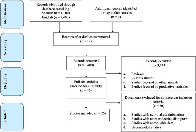 A systematic review was conducted on the Web (Figure 1); Google Scholar and PubMed were used as specialized information search engines with the aim of identifying studies that explored the effects of PEs present in the diet on the reproductive physiology of SAs, which have been published in blind peer-reviewed journals, extended abstracts in specialty congresses, and in graduate theses between 1996 and 2019. The keywords were established according to the PICO (Participants, Interventions, Comparisons and Outcomes) principle: P as slaughter animals (cattle, sheep, goats, equines, pigs, leporids and poultry); I as feeding with a diet rich in PEs; C as control groups, or groups of animals with low phytoestrogen diet, or reproductive variables of the same experimental group reported before or after exposure to the high-phytoestrogen diet; and R as reproductive variables in males and females. The statement of the topic of the review question was developed as: Do phytoestrogens present in the diet produce adverse effects on reproductive variables in SAs? According to the keywords, Google Scholar was first searched and, subsequently, PubMed, dated until June 2020. Generally, the following words and Boolean operators were used, in order to identify the studies available on the web: {‘Reproduction’ AND ‘Animals’ AND ‘Phytoestrogens’ AND/OR ‘Fertility’ AND/OR ‘Feed’ AND/OR ‘Isoflavones’ AND/OR ‘Coumestans’, AND/OR ‘Lingans’ AND ‘Cows’ OR ‘Heifers’ OR ‘Bulls’ OR ‘Ewes’ OR ‘Small Rumninant’ OR ‘Sheep’ OR ‘Ovine’ OR ‘Goat’ OR ‘Nanny-goat’ OR ‘Equine’ OR ‘Mare’ OR ‘Horses’ OR ‘Porcine’ OR ‘Sows’ OR ‘Pigs’ OR ‘Leporids’ OR ‘Rabbits’ OR ‘Hens’ OR ‘Rooster’ OR ‘Chickens’} {‘Reproducción’, AND ‘Animales’, AND ‘Fitoestrógenos’ AND/OR ‘Fertilidad’ AND/OR ‘Alimentación’ AND/OR ‘Isoflavonas’ AND/OR ‘Coumestanos’ AND/OR ‘Lignanos’ AND ‘Vacas’ OR ‘Vaquillas’ OR ‘Toros’ OR ‘Pequeños rumiantes’ OR ‘Ovejas’ OR ‘Ovinos’ OR ‘Cabras’ OR ‘Equinos’ OR ‘Yeguas’ OR ‘Caballos’ OR ‘Porcinos’ OR ‘Cerdas’ OR ‘Lepóridos’ OR ‘Conejos’ OR ‘Aves’ OR ‘Gallinas’ OR ‘Gallos’ OR ‘Pollos’}. All the articles were searched in English and Spanish, were initially examined by reading their abstracts. The full texts of the documents included preliminarily were reviewed again to select the material to be used. Figure 1 shows a flowchart that details the selection of studies.