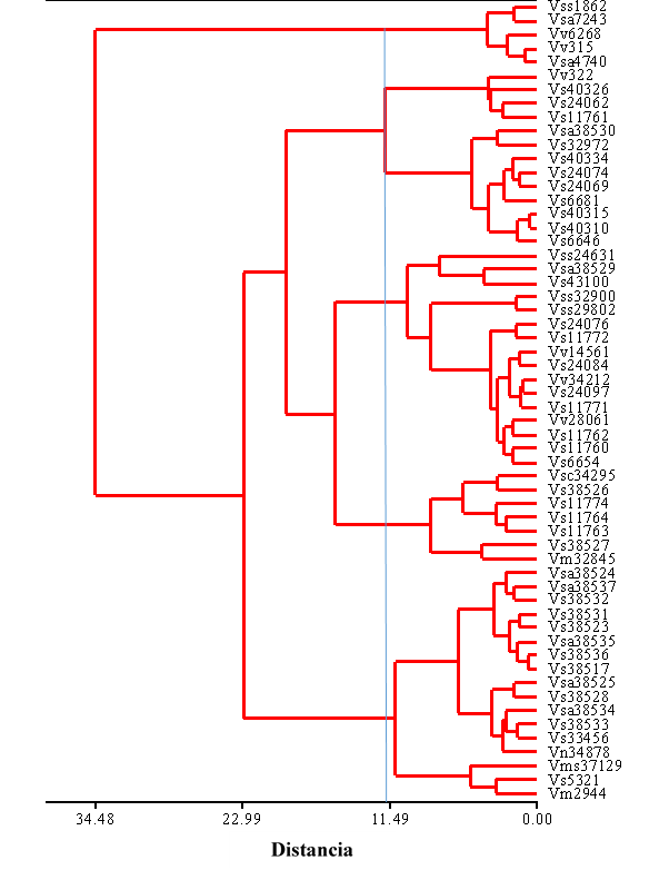 Figura 2 Dendrograma de 58 poblaciones de Vicia spp. explicado por el agrupamiento de enlaces completos de 12 características