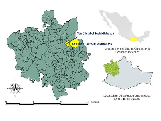 Figure 1 Study area. San Juan Bautista Coixtlahuaca and San Cristóbal Suchixtlahuaca, Mixteca region, Oaxaca, Mexico