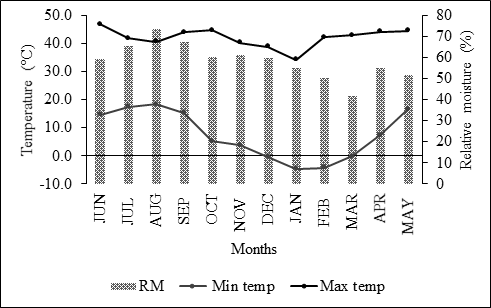 During the period from June 2021 to May 2022, a mean maximum temperature of 30 °C and mean minimum of 20 °C, as well as a maximum of 46.9 °C and minimum of -4.6 °C, were recorded inside the shade net (Figure 1), with mean and maximum temperatures per day of 16.6 to 40.1, 19.8 to 32.7, 9.8 to 37 and 4.5 to 30 °C during the spring, summer, fall and winter seasons, respectively. The average relative moisture recorded ranged between 44 and 73 %, with a minimum of 5-10 % in the months of May through July , and a maximum of 100 % during the rainy season, in July, August and September, with a regional historical annual average rainfall of 258 mm16. In order to avoid alterations of the soil moisture content in the pots due to the effect of rain, the experimental area occupied by the pots was covered with plastic during these periods.