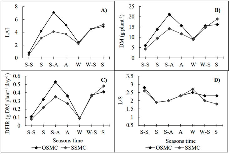The LAI showed the highest values in the spring, summer and summer-autumn periods, standing out in the OSMC plot during the summer, and then exhibiting an even behavior between the two soil moisture contents (OSMC and SSMC) in the rest of the year (Figure 2A). A similar behavior was observed for DM (Figure 2B) and DFIR (Figure 2C). L/S showed less variation by soil moisture content during the entire evaluation period (Figure 2C). These results coincide with the seasonal behavior of the temperature, which increases with the beginning of spring and reaches its highest values during the summer, being related to a higher incidence of solar radiation, with the consequent increase in the photosynthetic rate, and then begins to decrease in autumn, due to the beginning of the decrease in temperature24. Higher LAI values translate into higher biomass production25.