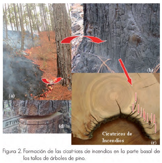 El sistema de muestreo empleado fue selectivo, en el entendido de que se escogieron especímenes con características adecuadas que permitieran cumplir con los objetivos planteados en el estudio en cada uno de los sitios. De las partes con cicatrices de incendios se obtuvieron con una motosierra secciones transversales totales de tocones, de árboles tirados y semienterrados, tramos de árboles muertos en pie y de árboles vivos (Arno y Snack, 1977) (Figura 2). Cuando el fuego quema la corteza y parte del cambium (Figura 2a), en la parte dañada del tronco se inhibe el crecimiento y se forma una cicatriz (Figura 2b). La incidencia de nuevos incendios origina nuevas cicatrices en la sección transversal del tallo (Figura 2c).