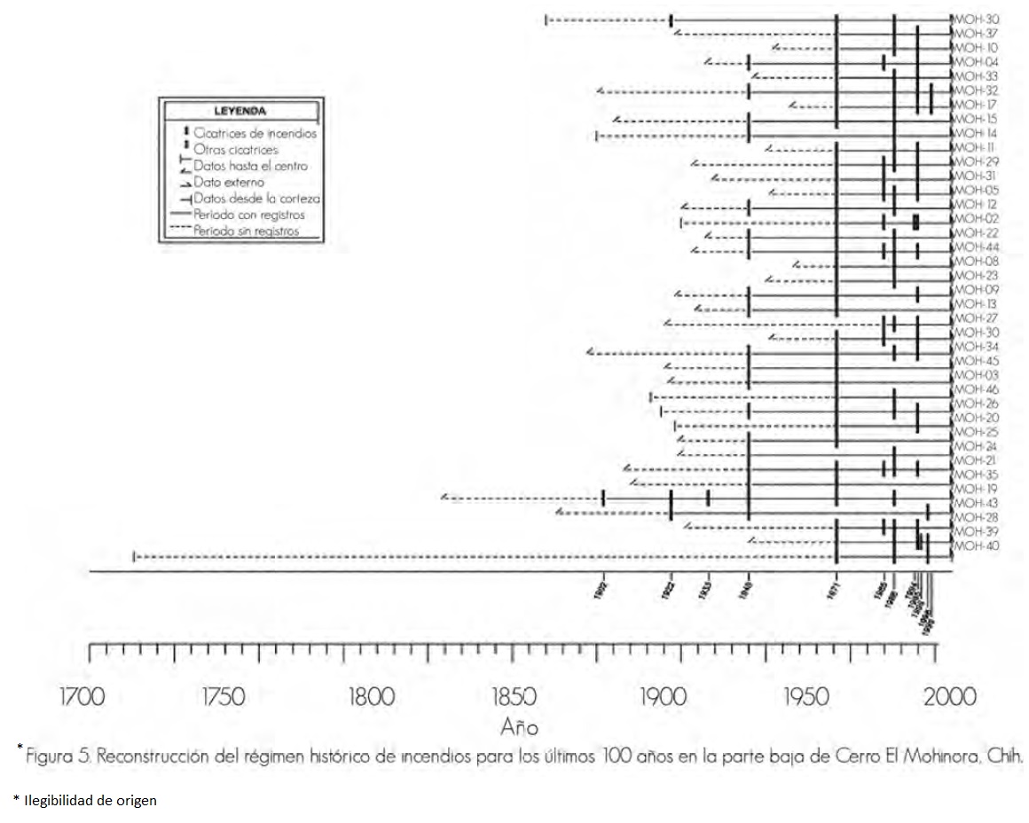El historial de regímenes de incendios de bosques de coníferas del estado de Chihuahua fue reconstruido con base en cicatrices de incendios registrados en la Reserva Cerro El Mohinora, localizada al suroeste del estado de Chihuahua. La importancia del área radica en la producción de agua que drena hacia la Planicie Costera del Pacífico, en Sinaloa; además de, constituir un hábitat de árboles relicto de Picea chihuahuana. En la reserva se colectaron secciones transversales con cicatrices de incendios de Pinus duranguensis, P. arizonica y P. ayacahuite; se fecharon 73 secciones transversales que contenían un total de 277 de dichas marcas. Los períodos de análisis de siniestros se extienden en la parte alta de la cuenca para los años de 1737 a 1999 y de 1902 a 1998 para la parte baja. Los de mayor incidencia de eventos reconstruidos para ambos sitios de la cuenca fueron 1945, 1971, 1988 y 1995. Los intervalos medios de frecuencia de incendios reconstruidos (MFI), al considerar el total de las muestras, variaron de 5.1 a 8.8 años y el intervalo medio de probabilidad de ocurrencia de incidencia (WMPI) fue de 3.8 a 6.0 años. Más de 80% de las conflagraciones se registraron en la estación de primavera. El SEA indicó que los años con este tipo de siniestros fueron significativamente secos (p< 0.01) y los años previos significativamente húmedos (p<0.05). Se confirmó la asociación entre la presencia de sequías y la ocurrencia de incendios con eventos ENSO.