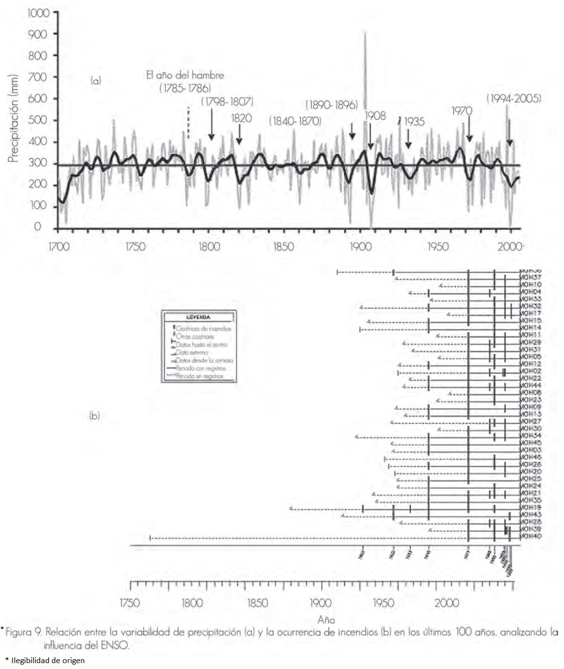 En general, el Cerro El Mohinora se vió afectado por incendios de gran intensidad en 1902, 1904, 1922, 1945 y 1971. Siete de los años con mayor incidencia corresponden a 1902, 1904, 1922, 1945, 1971, 1995 y 1988, lo que estuvo asociado a eventos extremos de ENSO (Figura 9); en 1971 y 1945 tuvieron lugar los fuegos más intensos y extensos en la región, indicativo de la intensidad del fenómeno ENSO en dichos años.