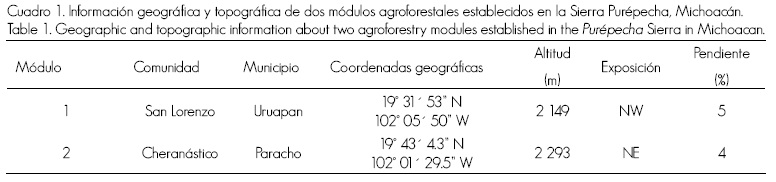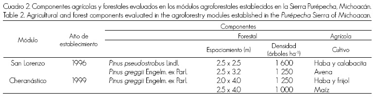 En los sitios estudiados se plantaron árboles en asociación con especies agrícolas y forrajeras anuales en terrenos de temporal, como alternativa para la recuperación del suelo. El primero se estableció en 1996, al este de la comunidad indígena de San Lorenzo, Uruapan; y el segundo en 1999, en Cheranástico, Paracho (Cuadro 1).