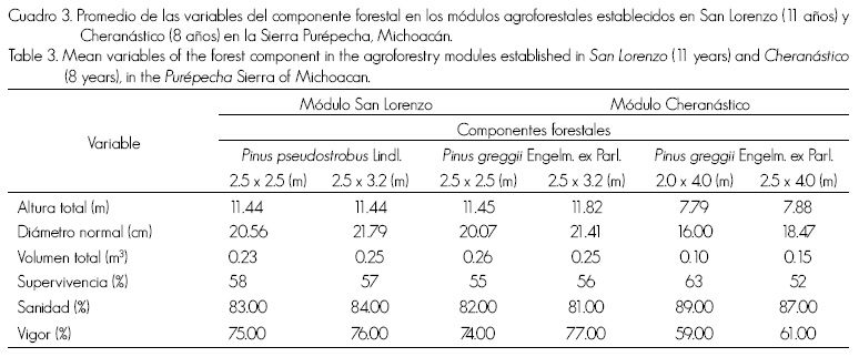 In Michoacan, a million hectares are devoted to low productivity crops which, besides, degrade the soil and have a low profitability. Two million hectares are estimated to be likely to recover through reforestation and commercial plantations. The purpose of this paper was to assess the agricultural and forestry components in two modules established as alley cropping: one in the indigenous community of San Lorenzo, Uruapan (1996) and one in Cheranástico, Paracho (1999). The former did not show significant differences between spacings 11 years after its implementation, according to the assessed dasometric parameters (total height, normal diameter, volume, survival, health and vigor). In 1999 oats had a yield of 6.5 t ha-1 of green weight, and during the 2000 cycle, of 2.8 t ha-1; this can be attributed to the growth of branches that reduced the adequate area for this crop's development, due to the shade effect. The latter module showed significant variations as to the normal diameter with a spacing of 2.5 x 4.0 m after eight years of established; this configuration allows a larger diametric growth of P. greggii. We conclude that the optimal spacing for the establishment of agroforestry plantations in the Purepecha Sierra is 2.5 x 4.0 m, and by using it in alley croppings, it is possible to obtain a combined yield.