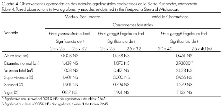 En el caso de Cheranástico este parámetro mostró un valor calculado superior al t de tablas con un nivel significativo de 0.05 %, lo que indica que existen diferencias importantes, con un diámetro promedio mayor en la configuración 2.5 x 4.0 m (cuadros 3 y 4). Estos resultados denotan que el espaciamiento influye en el crecimiento de P. greggii (Cuadro 4) y favorece el desarrollo diamétrico de los árboles en plantaciones agroforestales con cultivo en callejones. Cabe señalar que el crecimiento de P. greggii fue superior al observado en P. pseudostrobus.