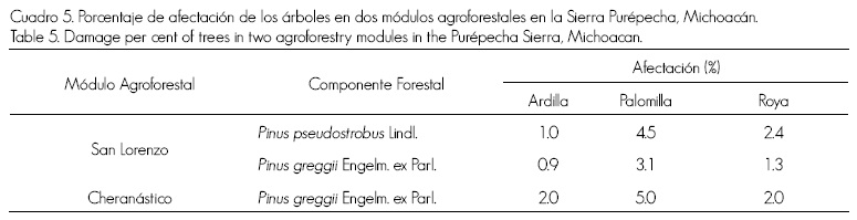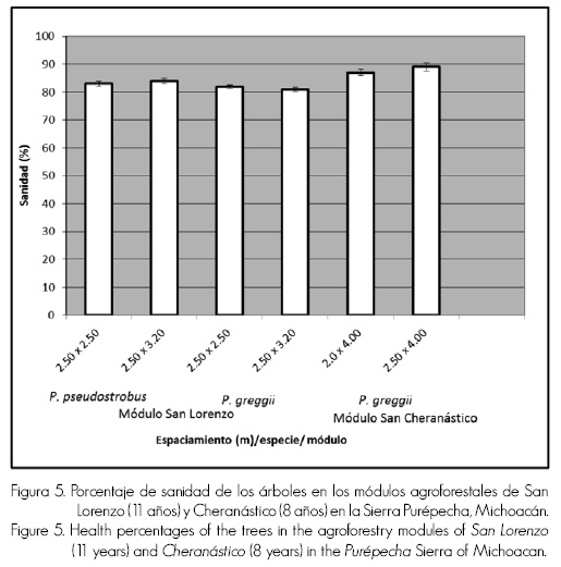Sanidad por módulo agroforestal. La calificación asignada fue buena, con un índice de 85 %; tanto en el caso de San Lorenzo (83 % de árboles sanos) como en el de Cheranástico (88 % individuos arbóreos sanos), la t calculada para las dos especies fue menor que el valor de t de tablas, con un nivel significativo de 0.05 %; por lo tanto, no se tuvieron diferencias significativas entre los espaciamientos (Cuadro 4 y Figura 5). Los daños que se identificaron fueron causados por fauna silvestre, plagas y enfermedades, entre ellos las ardillas (Sciurus vulgaris Linnaeus, 1758), la palomilla barrenadora (Dioryctria sp.) y la roya (Cronatium sp.) (Cuadro 5).