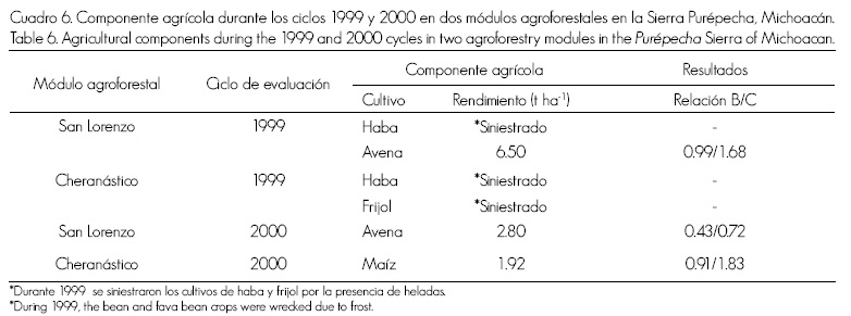 Módulo Cheranástico. En el ciclo 1999 se sembraron 2 068 m2 de haba y 365 m2 de frijol, con una densidad de 110 y 100 kg ha-1, respectivamente; la germinación se presentó a los 8 días, sin embargo, ambos cultivos presentaron afectaciones por heladas. Durante 2000 se utilizó maíz, con un rendimiento de 1.92 t ha-1 (Cuadro 6), valor que corresponde a su intervalo normal en la Sierra Purépecha, por lo que es una buena opción para los sistemas agroforestales. Lo anterior coincide con lo consignadodo por Vélez y Becerra (2007) en cinco módulos de Hidalgo, en los que se intercaló maíz, y generaron cantidades superiores a las de la zona: Criollo 2.87 t ha-1, Niebla 3.51 t ha-1 y Promesa 2.36 t ha-1; por su parte, Musálem (2003) en módulos agroforestales con poda e incorporación de biomasa obtuvo 1 878 kg ha-1 y sin poda, 1 508 kg ha-1 con la variedad Criolla. Martínez y Chávez (2007) establecieron dos parcelas en Mascota, Jalisco, de maíz forrajero bajo dosel de pino y encino, de las que resultaron 40 t ha-1 de forraje verde.