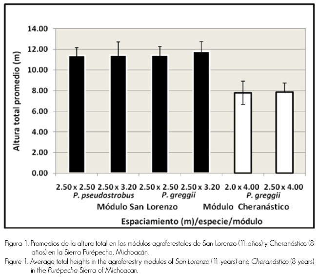 Respecto al incremento medio anual en altura (IMAA) en San Lorenzo, P. pseudostrobus registró 1.04 m año-1 y P. greggii, 1.07 m año-1, para ambos espaciamientos. En Cheranástico se presentó un IMAA de 0.97 m año-1. Los resultados de la primera especie se asemejan con lo documentado por García (1996a), quien evaluó cuatro taxa de pino en Capacuáro a los 5.8 años de edad y que obtuvo los mayores valores, en relación con Pinus montezumae, P. douglasiana Martínez y P. leiophylla Schltdl. et Cham. en todos los espaciamientos, con un IMAA de 1.00 m año-1.