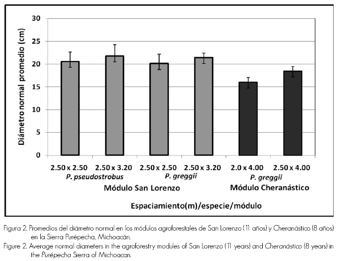 En el módulo San Lorenzo el incremento medio anual en diámetro (IMAD) para P. pseudostrobus fue mayor en la disposición 2.5 x 3.2 m, en comparación con el 2.5 x 2.5 m y para P. greggii los valores más grandes se presentaron en 2.5 x 2.5 m; en Cheranástico, el IMAD superior se registró con el espaciamiento de 2.5 x 4.0 m.