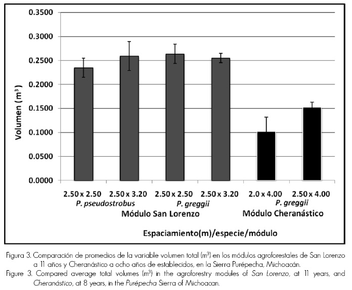 Volumen por módulo agroforestal. En San Lorenzo no se determinaron variaciones importantes, ya que el valor de t que se calculó fue menor que el t de tablas al nivel significativo de 0.05 %; asimismo los valores calculados para las dos especies no tuvieron significancia (Cuadro 4); resultados similares se obtuvieron en el módulo de Cheranástico (Cuadro 4). En la primera localidad, el volumen promedio para P. pseudostrobus varió entre tratamientos de 0.23 a 0.25 m3; y en el caso de P. greggii de 0.26 m3 a 0.25 m3, y en Cheranástico las diferencias fueron de 0.10 m3 a 0.15 m3 (Cuadro 3 y Figura 3).