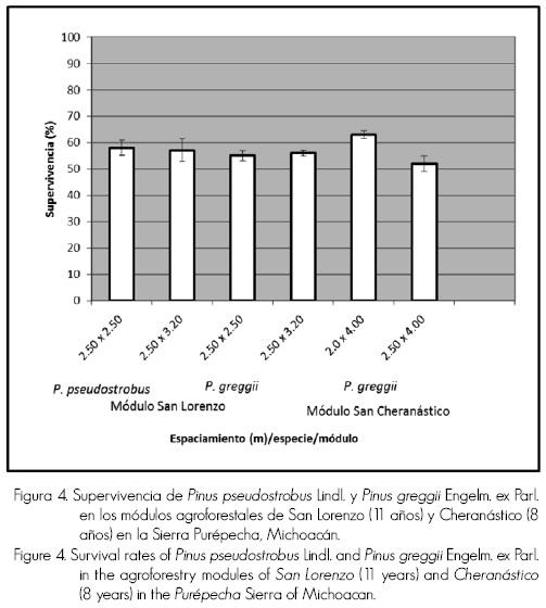 Supervivencia por módulo agroforestal. En San Lorenzo, el número de árboles vivos fue menor para t calculada, en ambas especies, que el valor de t de tablas con un nivel significativo de 0.05 %; en consecuencia, no existen diferencias importantes entre los tratamientos considerados. El porcentaje de supervivencia obtenida fue de 26 y 39 % para P. pseudostrobus con 3.20 x 2.50 m y 2.50 x 2.50, respectivamente, mientras que para P. greggii se calculó en 23 %, en ambos casos (Cuadro 3 y Figura 4). En Cheranástico la t calculada para P. greggii resultó menor que el valor de t de tablas (2.645) con la misma significancia, lo cual corrobora que los espaciamientos no afectan esta variable. La supervivencia fue de 52 % para 2.5 x 4.0 m. y 63 % para 2.0 x 4.0 m.