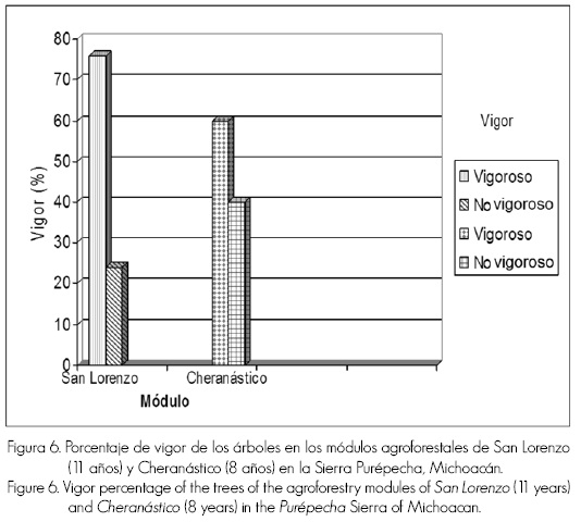 Vigor por módulo agroforestal. En los dos módulos las especies presentaron un estado vigoroso, el valor de t calculado para los dos taxa fue menor que la t de tablas con un nivel significativo del 0.05, por lo tanto, se puede concluir que no hay diferencias relevantes entre los espaciamientos. El índice de vigor se estimó en 76 % para San Lorenzo y 60 % para Cheranástico. En el primer sitio se observó una variación de 16 % entre especies, que se asocia a que P. pseudostrobus es un taxón nativo, más adaptado y con mayor resistencia a plagas y enfermedades; en cambio, P. greggii es introducido y tuvo síntomas de ataque por diferentes agentes. La edad del arbolado, a pesar de ser sujeta de competencia, no afecta esta variable en función del espaciamiento, por lo cual, no hay dominancia entre los árboles más aptos (Cuadro 4 y Figura 6).