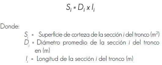 Se calculó la superficie de la corteza que existía en cada sección del tronco, con la siguiente fórmula: