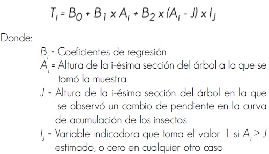 Para obtener la tasa de acumulación de insectos a lo largo del fuste se empleó un análisis de regresión segmentada de la forma:
