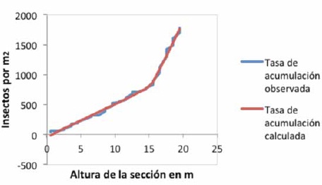 El análisis de la tasa de acumulación de ambas especies evidenció un punto de inflexión a una altura de 15.16 m; es decir, un cambio en la tendencia, que se incrementa de 54 ind m-2 a 222 ind m-2 (Figura 1). Lo anterior, posiblemente, está asociado a que la humedad y el grosor de la corteza favorecen el éxito de las crías de P. elatinus.