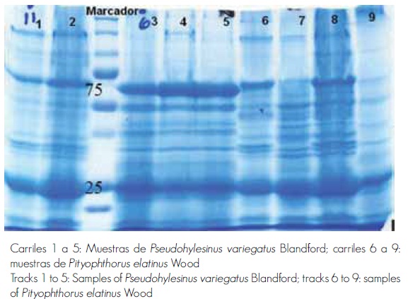 Los patrones proteicos fueron semejantes y generaron dos bandas bien definidas de 24 y de 75 KDa (Figura 2), lo cual resulta predecible, ya que los escarabajos estuvieron confinados al mismo árbol, por lo que probablemente solo actuó una cepa.