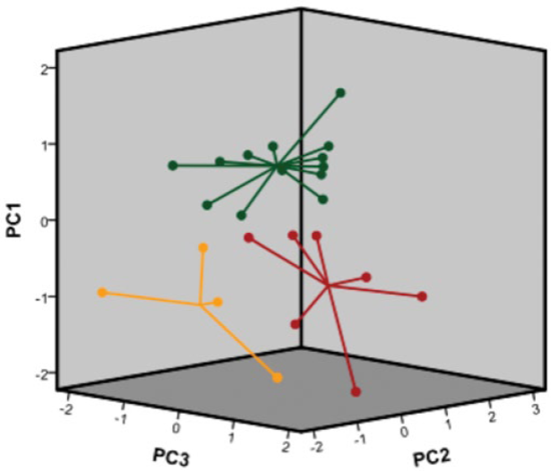 Figure 3 Three-dimensional distribution of groupings by vegetation type, constituted by the three first main components.