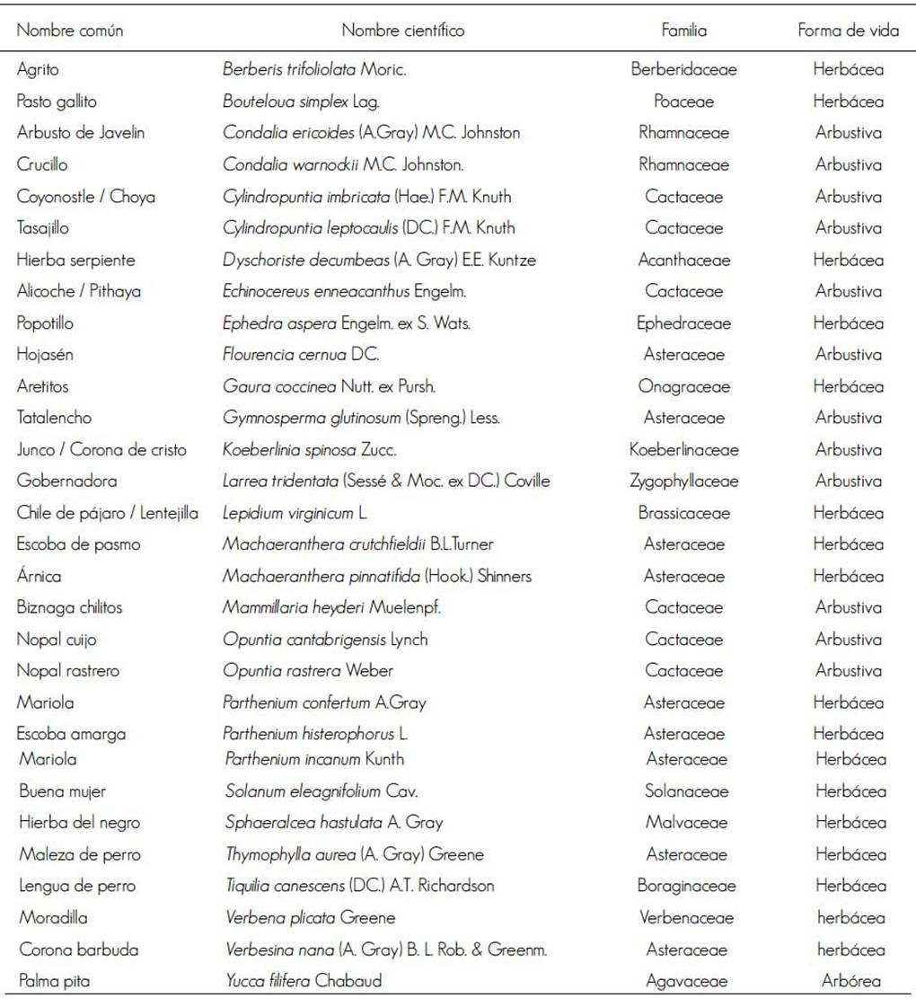 Para la caracterización de la vegetación presente en los sitios de muestreo se verificó la identidad de las especies y sus sinonimias a través de información bibliográfica de Brummitt y Powell (1992) (Correll y Johnston, 1970), recorridos de campo y a la recolección de ejemplares botánicos de todas las especies, que fueron identificadas y depositadas en el herbario de la Facultad de Ciencias Biológicas de la Universidad Autónoma de Nuevo León (UANL).