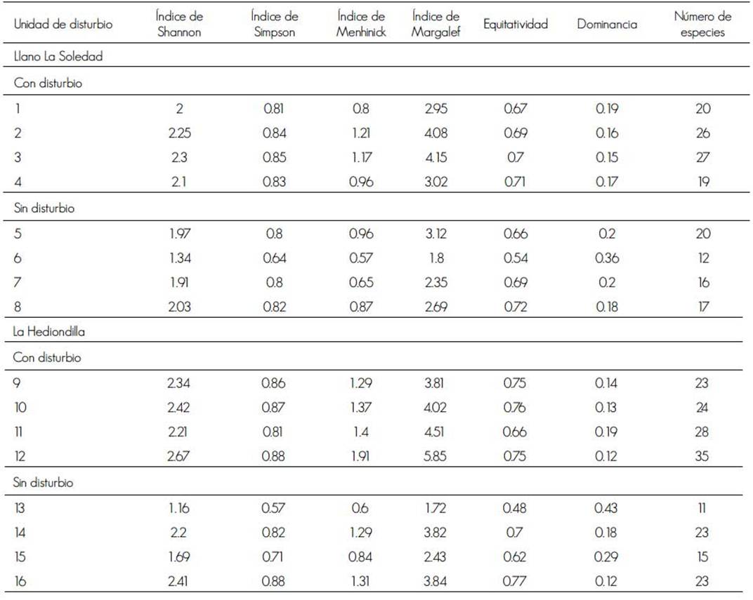La riqueza de especies y la diversidad florística de cada unidad de muestreo se determinaron mediante las cuantificaciones de diferentes índices como el de Shannon-Weiner, Simpson, Margalef y de Equitatividad, con base en las recomendaciones de Müeller-Dombois (1974), Franco (1989), Rosenzweigh (1995) y Mora (2014).