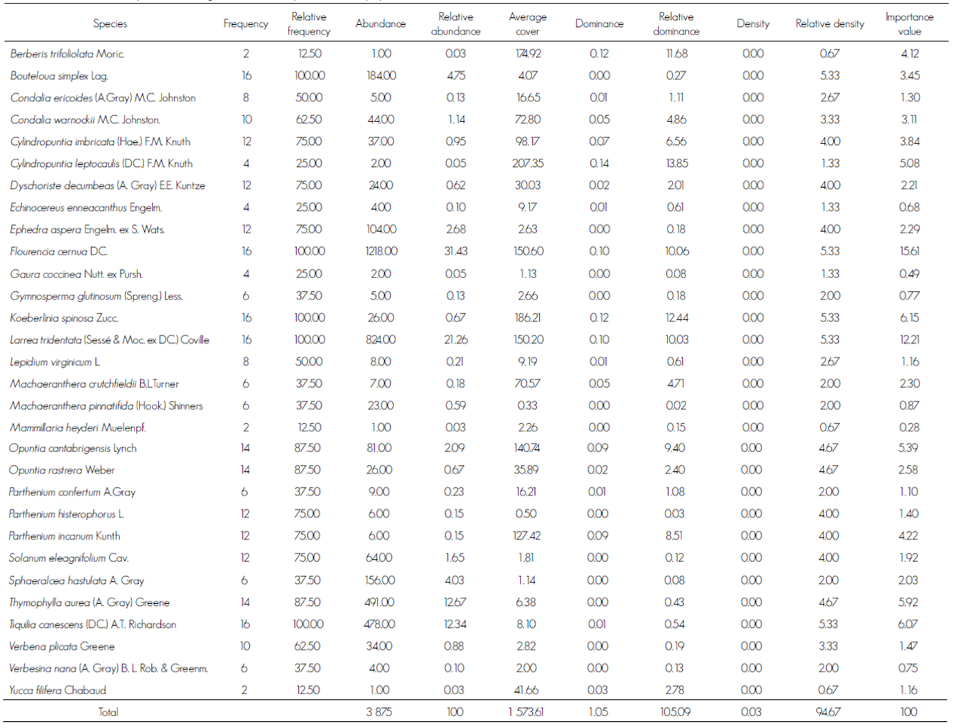 Frecuencia. Las especies de frecuencia destacada fueron Flourencia cernua, Larrea tridentata, Koeberlinia spinosa, Bouteloua simplex y Tiquilia canescens, pues están presentes en las 16 unidades de muestreo; lo opuesto ocurrió con Berberis trifoliolata, Mamillaria heyderi y Yucca filifera, que solo se les registró en uno de los sitios (Cuadro 3).