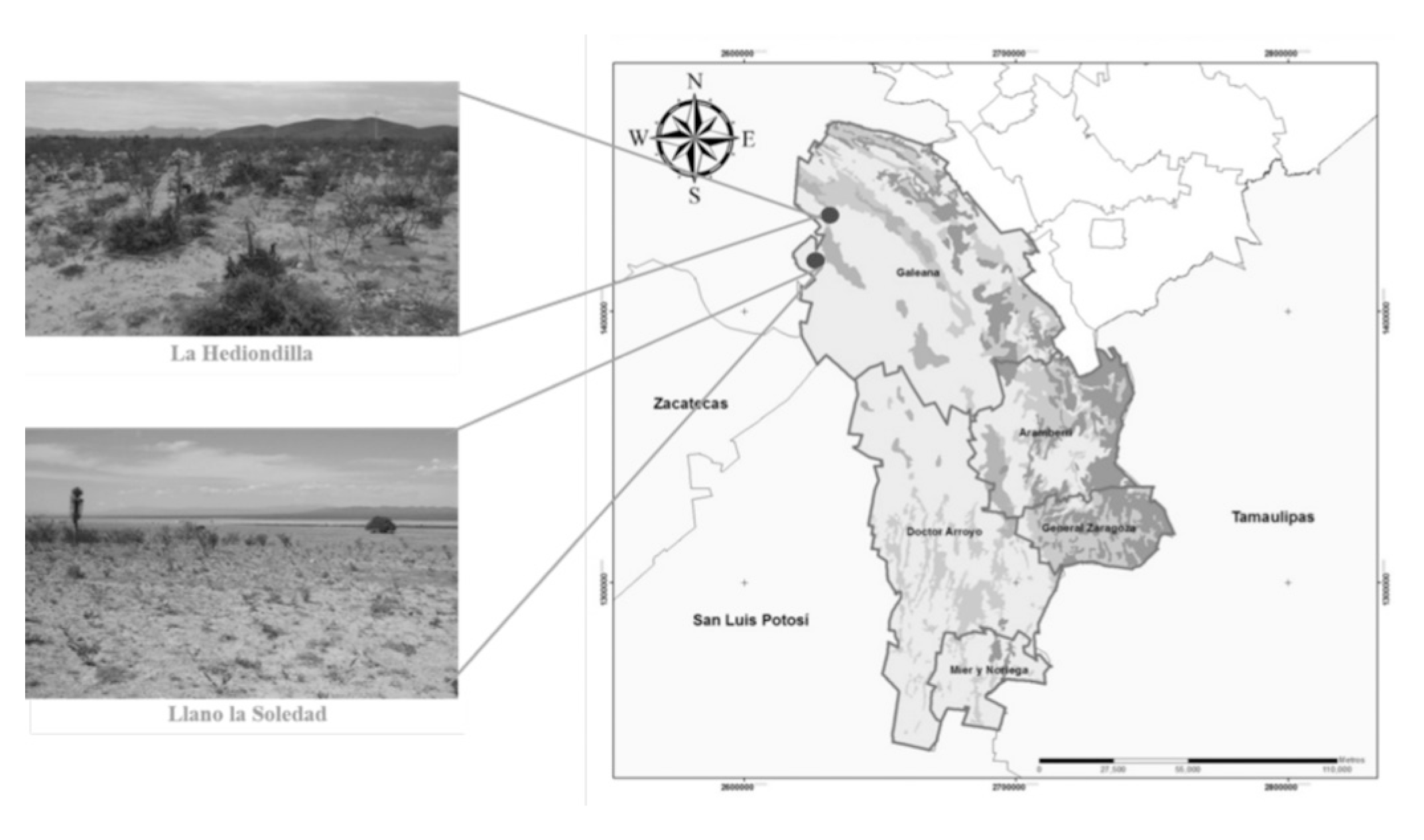 Se trabajó en un área de 1 988 ha de matorral desértico micrófilo del noreste de México, a una altitud de 1 880 m en el municipio Galeana. Se seleccionaron dos sitios de muestreo: el primero en Llano La Soledad entre los 24°52’32” N y 100°43’33” O y el segundo en La Hediondilla entre los 24°58’45”Ny100°41’49”O (Figura 1).El clima local corresponde al tipo seco o árido templado BSok(x ́), subtipo de los más secos con un cociente P/T menor de 22.9; temperatura media anual entre 12 °C y 18 °C, temperatura media del mes más frío entre 3 °C y 18 °C, temperatura media del mes más caliente menor de 22 °C; porcentaje de precipitación invernal con respecto al total anual, mayor de 18 %. Los suelos dominantes son del tipo Xerosol háplico y cálcicos que sustentan una vegetación resistente a altas concentraciones de yeso (Estrada-Castillón et al., 2010).
