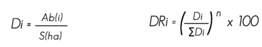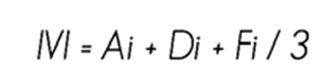 For each species the folowing structural variables were calculated: abundance, dominance, frequency and importance value, applying the following equations: