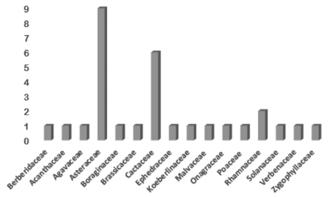 From the 30 species of trees, shrubs and herbs recorded in the 16 sampling units (Table 1), 3 875 individuals were assessed, which are grouped in 16 families, from which Asteraceae (9) and Cactaceae (6) are the most important and in the rest of the families, only 1 to 2 species were found (Figure 2). Unit 13 had the smallest number of species (1), while Unit 12 the highest with 35 especies, and both belong to La Hediondilla; these data confirm that the number of species is related to the degree of disturb of the area (Table 2).