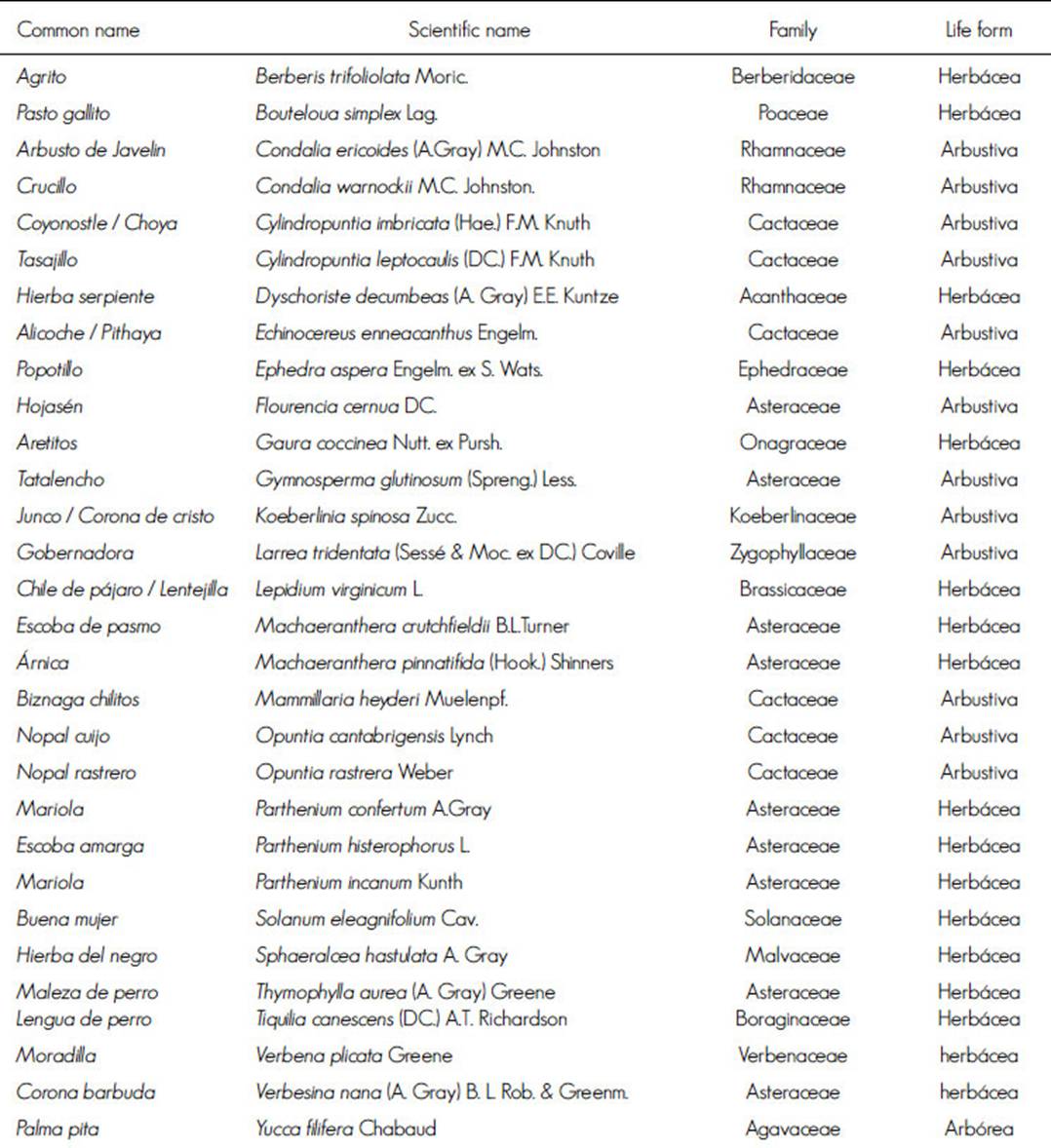 For the characterization of the vegetation present in the sampling sites, the identity of the species and their synonyms were verified through bibliographic information of Brummitt and Powell (1992) and Correll and Johnston (1970), field trips and the collection of botanical specimens of all species, which were identified and deposited in the herbarium of the Facultad de Ciencias Biológicas de la Universidad Autónoma de Nuevo León (UANL)