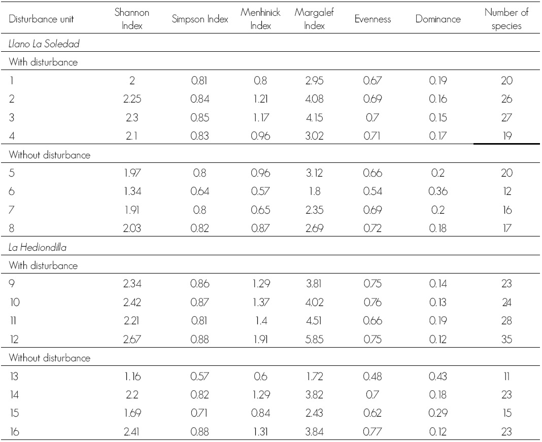 Margalef Index. The richness value (DMg) ranges from 2.95 to 5.85 for the sampling units under disturbance, while for those without it, ranges are from 1.72 to 3.84, which means that there is a significant difference between the species richness of the sites, with or without disturb (F = 4.44, P = 0.02) (Table 4).