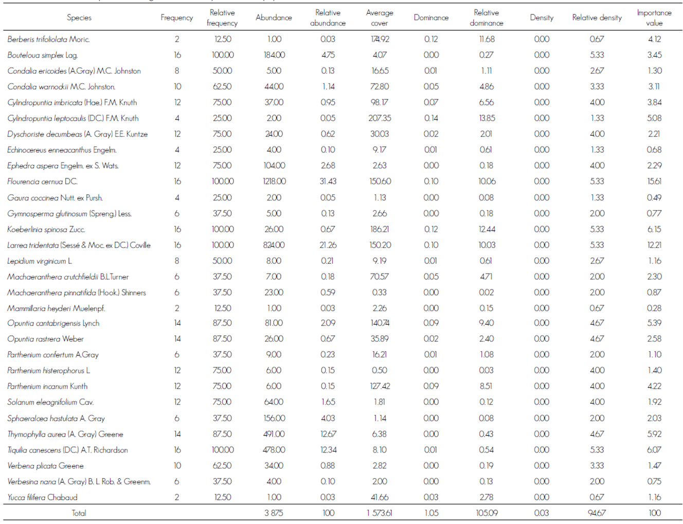 Frequency. The species of outstanding frequency were Flourencia cernua, Larrea tridentata, Koeberlinia spinosa, Bouteloua simplex and Tiquilia canescens, as they were present in the 16 sampling units; the opposite occurred with Berberis trifoliolata, Mamillaria heyderi and Yucca filifera, which were only recorded in one of the sites (Table 3).