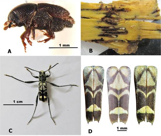 Figure 2 Stem-borer insects of Terminalia ivorensis A.Chev. A - B. Bark borer beetle Scolytopsis puncticollis Blandford, 1896. A. Side view. B. Damage. C - D. Cotyclytus scenicus (Pascoe, 1866) beetle with long antennae. C. Habitus. D. Elytra variation.