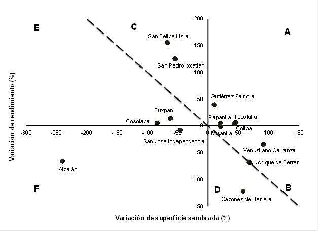 From 2003 to 2014, 63 % of national production was based on 14 municipalities that registered continuous operations (SIAP, 2017). Table 2 shows the productivity of these municipalities from 2009-2014 compared to 2003-2008 and their importance in the national context; Four municipalities (Gutiérrez Zamora, Papantla, Tecolutla and Colipa in Veracruz) have increased their sown area and field yield (Type A). Misantla and Juchique de Ferrer (Veracruz), and Venustiano Carranza (Puebla) have adopted an extensive model (Type B); San Felipe Usila and San Pedro Ixcatlán (Oaxaca) an intensive model (Type C). However, the most drastic scenarios are located in Atzalán, Cazones de Herrera and Tuxpan (Veracruz), and San José Independencia and Cosolapa (Oaxaca) where productivity has declined (Type D, E and F). Figure 3 illustrates, above the dotted diagonal, the municipalities that had growth in production, and below those that showed a reduction in production for the period 2009-2014 compared to 2003-2008.