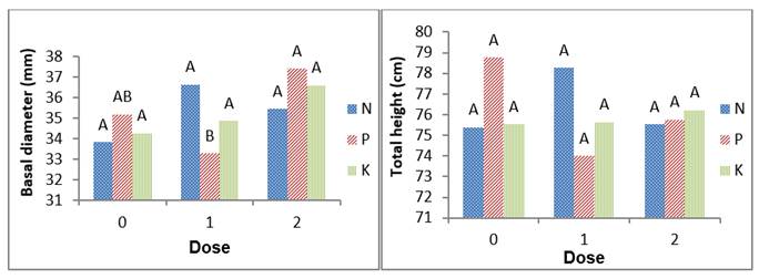 In the case of the total height of 2014, the analysis showed that the tested factors produce no significant effects (Table 3, Figure 1). This may be due to a high variability of the height of the seedlings between experimental units, which in turn were a result of the system of reproduction of the species in the nursery (from seeds), since the germplasm used in the local nurseries generally lacks a strict quality control (Gülcü and Bilir, 2017). Even when there were no significant effects, the Tukey test for the variable total height 2014 exhibited a trend which indicates (Figure 1) that the average dose of N generated the greatest height, i.e., that N is a deficient nutrient, at least partially in this area, as the height of seedlings responded favorably, though not significantly, to its application.