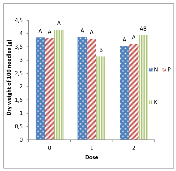 The Tukey test (α=0.05) indicates that the doses of N and P did not have a significant effect on the dry weight of 100 needles (Figure 2). On the other hand, there were differences between doses zero and one of K; of these, the first proved to be the better, i.e. the application of potassium had a negative impact on the growth of needles. This means that potassium is a nutrient found in sufficient quantities in the study site, and its application probably generates an imbalance (excess) with respect to the most deficient nutrients (López-López and Alvarado-López, 2010).