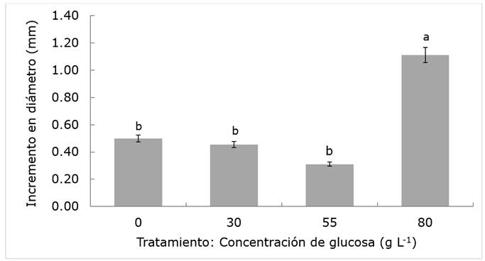El incremento en altura presentó diferencias significativas (P≤0.05) a la inyección de glucosa; la altura de los árboles mostró valores promedio superiores para las dos concentraciones más altas de glucosa (55 y 80 g L-1), en comparación con las concentraciones bajas (0 y 30 g L-1) (Figura 2). Esto puede indicar que las primeras estimulan el crecimiento en altura (Martínez et al., 2013; Percival y Sacre, 2014). En ciertas especies de latifoliadas como sauces (Salix sp.), álamos (Populus sp.), abedules (Betula sp.) y arces (Acer sp.). El crecimiento de la yema apical y la floración se manifiesta mucho antes del crecimiento vegetativo (Percival y Sacre, 2014). Etapas iniciales de reproducción vegetativa dependen exclusivamente de las reservas que el árbol acumuló en el ciclo de crecimiento anterior (Percival y Sacre, 2014; Ramírez et al., 2018). Esto apoya la idea de que la aplicación exógena de carbohidratos estimula el crecimiento en árboles urbanos (Martínez et al., 2013).