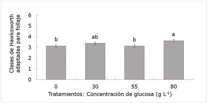 El nivel de producción de follaje estuvo influido por la concentración más alta de glucosa (P≤0.05). A pesar de esto, esta variable, independientemente de la concentración de glucosa, se ubicó entre las clases 3 y 4 (Hawksworth, 1977); por lo tanto, se consideran valores satisfactorios. La producción de follaje se relaciona directamente con la variable Dnc descrita, por lo que se observó que a mayor valor de Dnc, también se incrementó el follaje, como lo muestran los resultados para la concentración de 80 g L-1 (Figura 4). Esta cantidad de hojas le permite al arbolado sobrevivir y realizar sus funciones de forma correcta (Zaragoza et al., 2014).