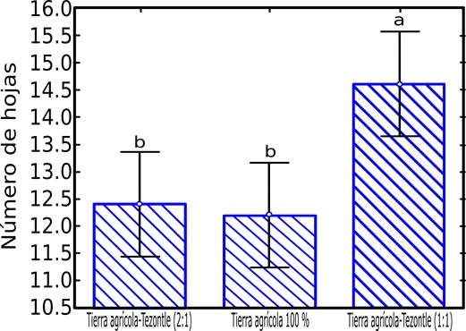 Para la variable de número de hojas, la prueba de comparación de medias Tukey demostró que las plantas con tierra agrícola-tezontle (1:1) tuvieron más cantidad de follaje, en comparación con el resto de los tratamientos (Figura 2). Lo que es atribuible a la presencia de un sistema radicular más desarrollado (reflejo de su mayor biomasa), el cual favoreció que brotaran más hojas, como lo sugieren Di Stéfano y Fouriere (1999).