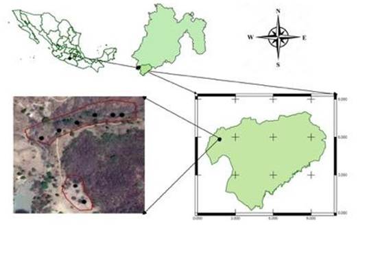 The study was carried out in the commercial forest plantation (PFC, for its acronym in Spanish) of G. arborea located in the Las Piñas farm, Tlatlaya municipality, State of Mexico (Figure 1). The region is part of the Sierra Madre del Sur physiographic province and the Depression of the Balsas River subprovince (Inegi, 2009). The geographical coordinates of the area of interest are 18°22´ N and 100°04´ O; its average altitude is 694 m and has a slope of 40 %.