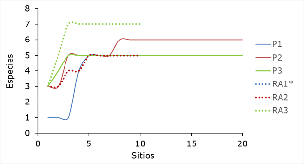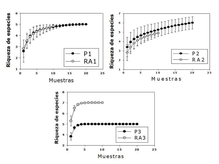 From the information on the number of new species per site, the accumulated richness curves were obtained, to left that the sampling effort was enough and included most of the species present both in the plantations and in the RAs (Dzib et al., 2014).