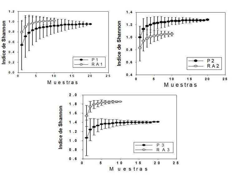 Figure 4 Rarefaction graphics constructed for the Shannon-Wiener proportional diversity (95 % confidence).