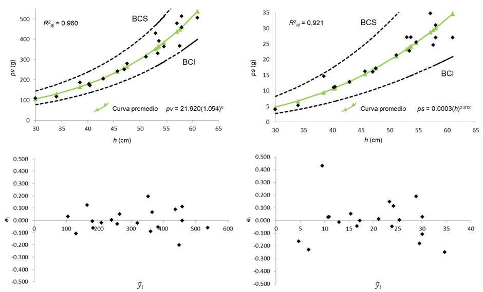 To predict biomass production in terms of pv and fiber yield given by ps, the regression adjustment of 18 linear and non-linear allometric models (9 for each dependent variable) was evaluated (Table 1), the method of least squares in Excel® was applied; for this end, the variables best correlated with the pv (g) and ps (g) were used. For the selection of the best models, the following criteria were used: Probability of committing the Type I Error (P<0.01) in the regression, the highest value of the adjusted coefficient of determination (R 2 aj ), minimum values for the root of the Mean Square of the Error (RCME), Coefficient of Variation (CV), Cp Mallows statistic (Cp), absolute value of the prediction sum of squares (│PRESS│), and prediction sum of squares (PRESS) (Zar, 1999; Walpole et al., 2012). Subsequently, the Breusch-Pagan (BP) test (P<0.01) for homoscedasticity was applied (Breusch and Pagan, 1979; Maldonado-Ortiz et al., 2022). It was sought that the model used included within its confidence bands (99 %) all the observations organized in intervals for new values of pv (g) and ps (g), respectively (Semarnat, 1996; Zar, 1999; Walpole et al., 2012).