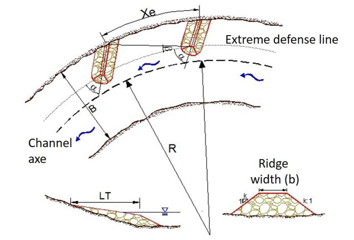Where in: Xe is the separation between groins; B, the width of the river; R, the radius of curvature; LT, the working length; k, the slope; φ, the orientation angle; and β, the expansion angle.