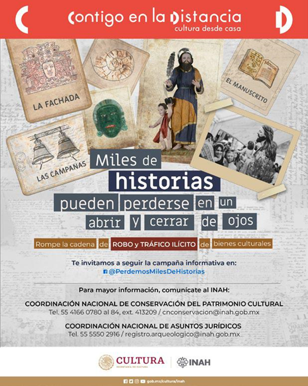 The theft of cultural property is an international problem that affects countries with cultural heritage such as Mexico’s. The Instituto Nacional de Antropología e Historia (INAH), responsible for the regulation and protection of paleontological, archaeological and historical cultural property, generates tools that prevent illegal trafficking. Its Coordinación Nacional de Conservación del Patrimonio Cultural (CNCPC-INAH) has generated a Risk Management Program for Preventive Conservation and to Avoid Illegal Trafficking of Cultural Property. The program consists of three campaigns: regulations, training and updating, and communication campaign, titled What do We Stand to Lose When Our Heritage is Stolen? that will be responsible for generating public discussion about the seriousness of this issue.
