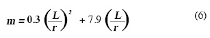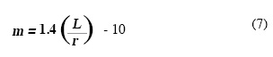 En la Fig. 4 se muestra la variación de la pendiente de las rectas correspondientes a cada grupo de pruebas (m) y el valor de la ordenada al origen (b) respecto a L/r. De aquí se puede observar que existe una tendencia clara de la variación de ambos parámetros respecto a la relación de esbeltez. Si nuevamente se realiza un ajuste, ahora con un polinomio de segundo grado para el caso de la pendiente y uno lineal para la ordenada al origen, se pueden expresar estas variaciones mediante las Ecuaciones 6 y 7
