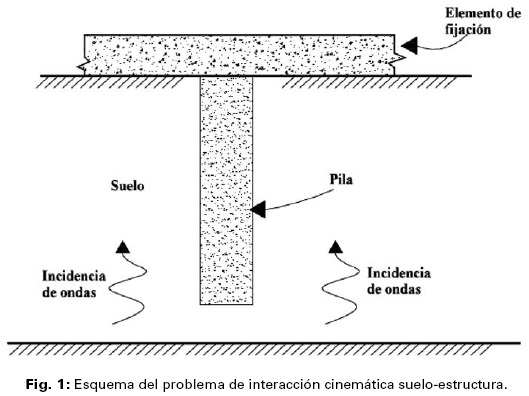 Por otro lado, cuando se trata de cimentaciones profundas (pilas o pilotes), además de considerar las acciones que introducirá la superestructura en la cabeza de dichos elementos, es necesario considerar las solicitaciones dinámicas producto del paso de las ondas sísmicas a través del elemento de cimentación. Estas acciones se pueden asociar con la cinemática del fenómeno de interacción, ya que son producto exclusivamente de la necesidad del elemento de cimentación de acoplar el campo de desplazamientos que se produce en el suelo debido a la incidencia de las ondas elásticas mediante las cuales se propaga el sismo (Fig. 1).